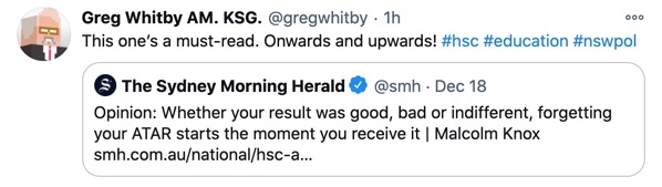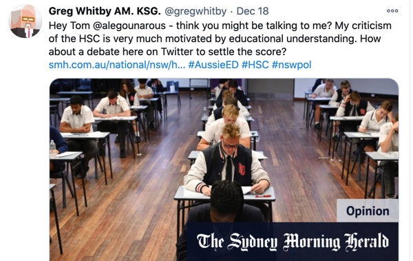 On December 18, 2020 there was an opinion piece in the Sydney Morning Herald, written by former chairman of the NSW Education Standards Authority (NESA), Tom Alegounarias. His piece, HSC is a glittering asset and we must protect it articulated the merits of the HSC and mounted a defence against a rising number of its critics. Later that afternoon, there was another opinion piece, HSC a brutal and irrelevant way to define ‘intelligence’ in a world opening its eyes to other values penned by journalist, author and columnist for SMH, Malcolm Knox. Both articles prompted tweets from the Executive Director of Catholic Education Diocese of Parramatta (CEDP), Mr Greg Whitby.